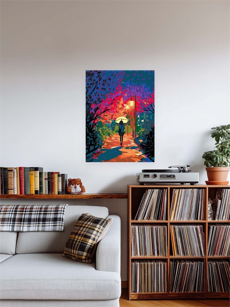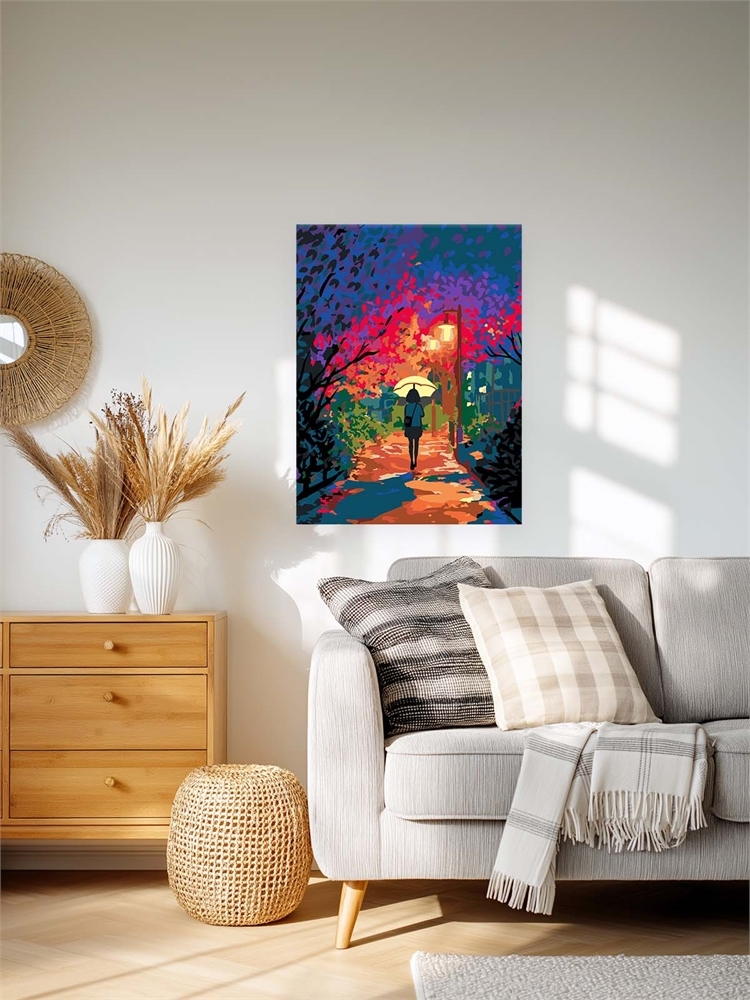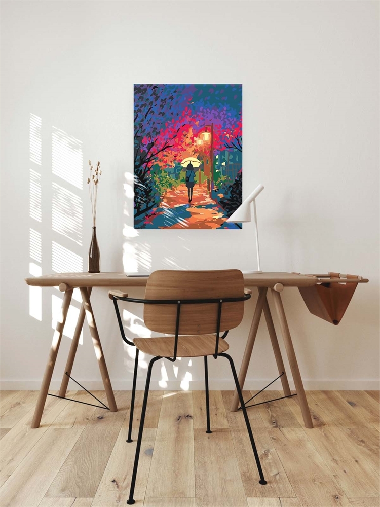 Сюжетные теги: человек, зонтик, осенний парк, фонарь, осень, прогулка, листва, освещение, силуэт